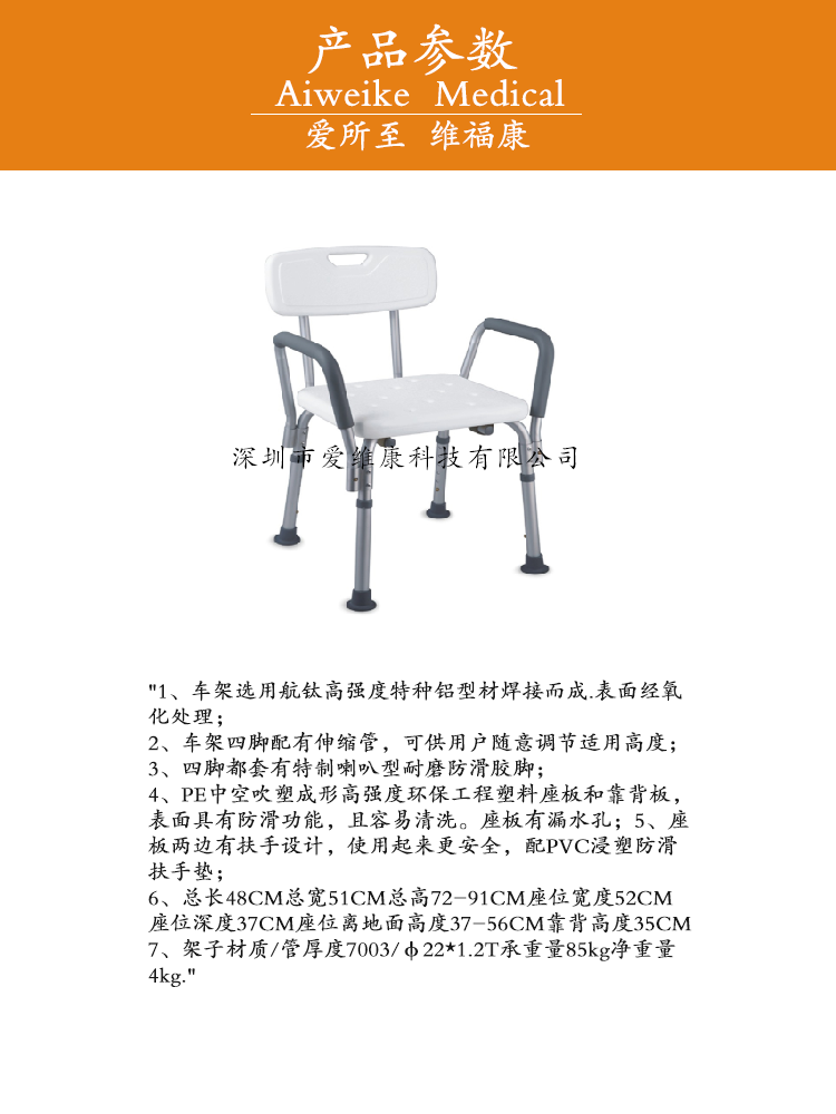 愛(ài)維康車架四腳配有伸縮管可供用戶隨意調(diào)節(jié)適用高度洗澡椅