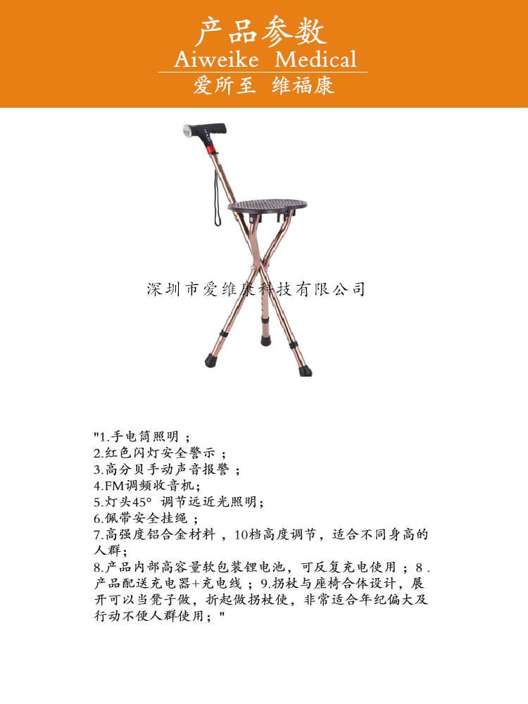"愛維康紅色閃燈安全警示 3高分貝手動(dòng)聲音報(bào)警智能拐仗凳"